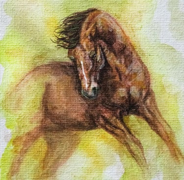 In dit kleine schilderij komt zijn vurige speelse karakter tot leven. De rijke voskleur gloeit op het doek, terwijl zijn lijf zich met speelse kracht beweegt. Elk penseelstreek ademt energie — een moment gevangen waarin hij volledig opgaat in zijn eigen spel, vol vuur en passie.