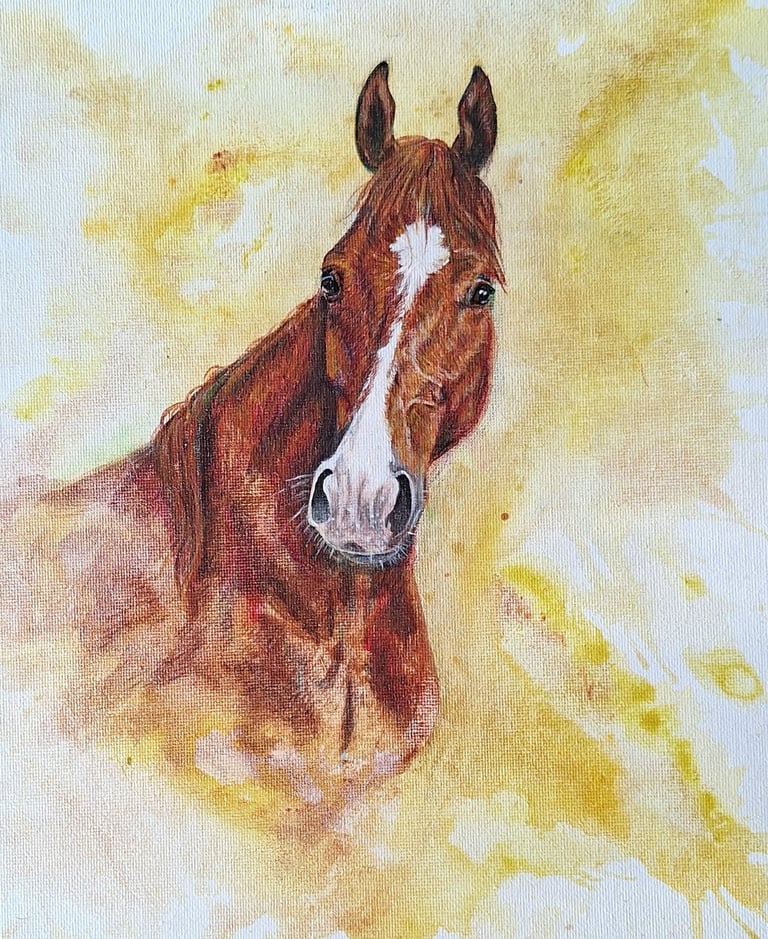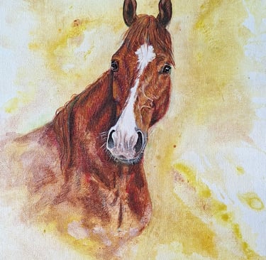 Zijn open, verbaasde blik vangt precies wie hij was: een jonge ziel vol verwondering, speels en oprecht. Nog maar twee lentes oud, maar stevig geworteld als een echt aarde-paard. Betrouwbaar, warm en altijd op zoek naar gezelligheid, een vrolijke clown met een hart van goud. In dit schilderij leeft zijn licht nog even voort.