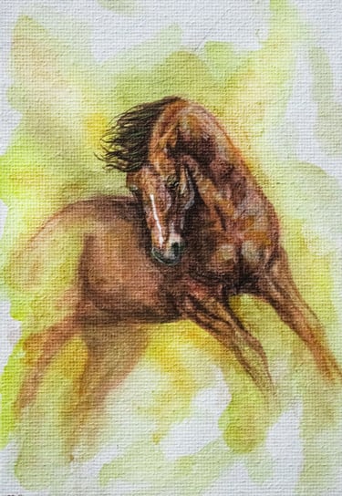 In dit kleine schilderij komt zijn vurige speelse karakter tot leven. De rijke voskleur gloeit op het doek, terwijl zijn lijf zich met speelse kracht beweegt. Elk penseelstreek ademt energie — een moment gevangen waarin hij volledig opgaat in zijn eigen spel, vol vuur en passie.