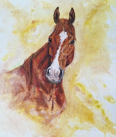 Zijn open, verbaasde blik vangt precies wie hij was: een jonge ziel vol verwondering, speels en oprecht. Nog maar twee lentes oud, maar stevig geworteld als een echt aarde-paard. Betrouwbaar, warm en altijd op zoek naar gezelligheid, een vrolijke clown met een hart van goud. In dit schilderij leeft zijn licht nog even voort.